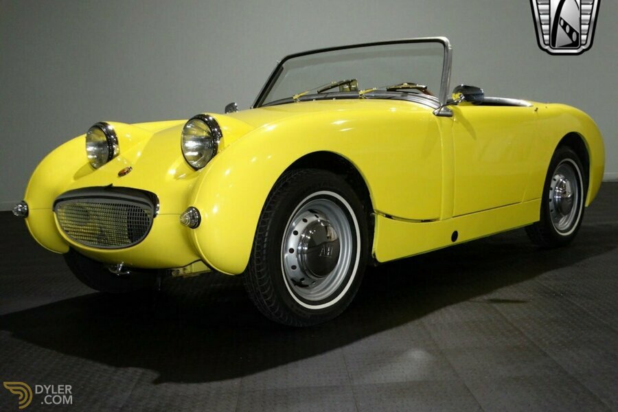 Zu den Optionen für diesen Austin-Healey Bugeye Sprite von 1959 gehören: Vinyl-Innenausstattung, Sicherheitsgurte, manuelles Verdeck, klassische Felgen und Radialreifen.