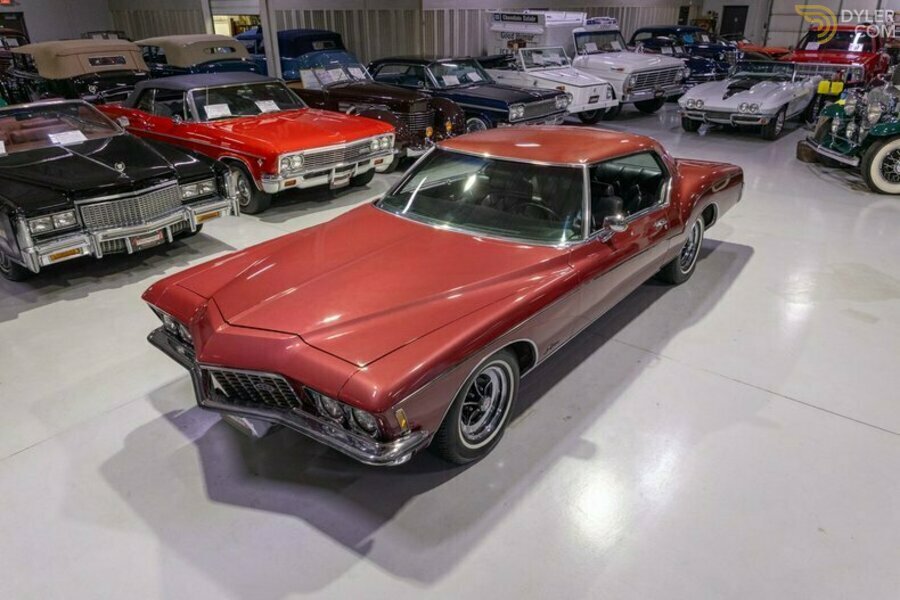 Dieser 1972 Buick Riviera ist ein wunderbar erhaltener 2-Besitzer Boattail Cruiser, der mit fantastischen Optionen ausgestattet ist und extrem gut dokumentiert ist. Buick stellte sein Riviera-Modell erstmals am 10. September 1962 im Las Vegas Riviera Hotel vor, sozusagen als Gegenstück zum beliebten Ford Thunderbird, dem Spitzenmodell der Marke. Im Laufe der Jahre änderten sich das Design und die Ausstattung des Riviera. Am 22. September 1970 kündigte Buick seinen vielleicht radikalsten Riviera für das Modelljahr 1971 an, der mit seiner ikonischen "Bootsschwanz"-Karosserielinie Anfang Oktober in den Ausstellungsräumen der Händler erschien. Der 1972er Buick Riviera behielt den Bootsheck-Look im Modelljahr '72 weitgehend bei, allerdings mit einigen stilistischen Neuerungen. Vorne blieb das nach vorne geneigte Design erhalten, aber ein neuer, gegossener "Eierkarton"-Kühlergrill ersetzte den Kunststoffkühlergrill des Vorjahres, der auf einer stärkeren Stoßstange montiert war. Die Seitenteile wurden außerdem mit einer neuen Gürtellinie verziert, die die einzigartige Silhouette des 72er Riviera betont. Am Heck wurde '72 eine neue Rückleuchtenbaugruppe mit 3 vertikalen Balken eingeführt, die die Rückleuchtenlinse unterteilen. Die andere wichtige Neuerung am Heck des Riviera im Jahr 1972 war die Entfernung der "Full Flo"-Lüftungsschlitze, die 1971 angeblich die Undichtigkeit der Kofferräume verursacht hatten. Auch die ultra-luxuriöse Innenausstattung blieb 1972 gegenüber 1971 weitgehend unverändert, allerdings wurde 1972 zum ersten Mal ein 60/40 "Notch Back"-Vordersitz für die Käufer des Buick Riviera verfügbar gemacht. Insgesamt wurden 1972 nur 33.728 Buick Rivieras produziert, was diesen klassischen Buick zu einem sehr seltenen Oldtimer macht. Dieser besondere 72er Riviera wird uns vom Zweitbesitzer des Fahrzeugs zusammen mit einer umfangreichen Dokumentation zur Verfügung gestellt. Unter der massiven Motorhaube dieses 1972er Buick Riviera befindet sich ein 455 Kubikzoll V8-Motor, der von einem einzigen 4-Fass-Vergaser gespeist wird und im Neuzustand 250 PS geleistet haben soll. Der Auspuff verlässt den 455er über eine kehlige Doppelauspuffanlage, die im Leerlauf oder beim Fahren auf der Straße einen fantastischen Klang erzeugt. Der 455 V8 wird von einem Turbo-Hydramatic-400-Automatikgetriebe unterstützt, das dieses Auto zu einem angenehmen und einfachen Klassiker macht, mit dem man zu einer Autoshow oder einer Nachmittagstour fahren kann. Sie werden auch in der Lage sein, den Gummi auf dem Asphalt zu halten, da dieser Riviera mit einer optionalen Positraction-Hinterachse ausgestattet ist. Neben dem muskulösen Triebwerk, das diesen 72er Riv auf der Straße antreibt, gibt es eine unglaubliche Auswahl an Funktionen und Optionen! Mit der Servolenkung ist es ein Leichtes, diesen fast 4.500 Pfund schweren Luxuskreuzer in enge Parklücken hinein- und wieder herauszuparken, da dies mit nur einer Hand leicht zu bewerkstelligen ist. Eine weitere Hilfe beim Einparken ist der verchromte Spiegel auf der Fahrerseite, den Sie mühelos mit der Innenraumfernbedienung einstellen können. Darüber hinaus können Sie diesen Full-Size-Buick viel bequemer zum Stehen bringen, da er auch mit Power-Frontscheibenbremsen ausgestattet ist, die eine viel bessere Bremsleistung als manuelle Trommelbremsen bieten. Dieser 1972er Riviera gleitet auf einem Satz P235/75R15 Weißwand-Radialreifen, die auf einem Satz optionaler Fünfspeichen-Chrom-Sporträder (Rallye) montiert sind, über die Straße, was bedeutet, dass Sie in der Lage sein werden, ruhiger und mit noch mehr Stil zu fahren! Die prächtige Karosserie dieses 72er Buick wurde korrekt in Vintage Red lackiert, was das äußere Erscheinungsbild dieses luxuriösen Riv vervollständigt. Das Interieur dieses 1972 Buick Riviera ist eine erstaunliche Zeitkapsel! Die 60/40-Klappsitze und die Mittelarmlehne sowie die Rücksitzbank tragen die korrekte schwarze Madrid-Polsterung, die mit den korrekten diamantgetufteten Nähten verziert ist. Die holzgetäfelten Türverkleidungen und das Lenkrad, die schwarzen Sonnenblenden, das gepolsterte Armaturenbrett und die brandneuen schwarzen Teppiche und Fußmatten scheinen in hervorragendem Zustand zu sein und bleiben in der Serienausstattung. Darüber hinaus ist der Innenraum absolut vollgepackt mit Funktionen! Sie werden selbst an den heißesten Sommertagen einen kühlen Kopf bewahren, denn dieser 72er Riviera ist mit einer Klimaanlage ausgestattet. Vielleicht möchten Sie die Klimaanlage nicht benutzen und nur eine kleine Brise frische Luft schnuppern; kein Problem, denn Sie können alle 4 elektrischen Fensterheber mit einem einfachen Knopfdruck bedienen. Das 3-Speichen-Lenkrad mit Holzmaserung ist ebenfalls auf einer neigbaren Säule montiert, so dass jeder bequem hinter dem Lenkrad Platz nehmen kann. Sogar die Fondpassagiere können ihre eigenen elektrischen Fenster herunterlassen, und jede Seite im Fond ist außerdem mit einem Zigarettenanzünder und einem Aschenbecher ausgestattet. Längere Fahrten mit diesem Buick Riviera werden durch den zusätzlichen Tempomat noch komfortabler, der eine wunderbare Ergänzung für jeden Oldtimer darstellt. Das Kombiinstrument ist mit einem Tachometer (120 MPH) und einer Tankanzeige ausgestattet und verfügt über verschiedene Kontrollleuchten, darunter eine Öldruck-, eine Motortemperatur-, eine Batterielade-, eine Brems- und sogar eine Anschnallkontrollleuchte. Sie werden auch in der Lage sein, all Ihre Musik zu hören, während Sie die Straße entlang cruisen, da dieser Riviera mit einem optionalen AM/FM-Stereo mit integriertem 8-Track-Player ausgestattet ist. Der Innenraum ist mit Sicherheitsgurten, einem ausziehbaren vorderen Aschenbecher und Zigarettenanzünder sowie einem abschließbaren Handschuhfach ausgestattet. Ganz gleich, ob Sie Ihren allerersten Oldtimer kaufen oder Ihre bestehende Sammlung erweitern wollen, dieser 1972 Buick Riviera ist eine ausgezeichn