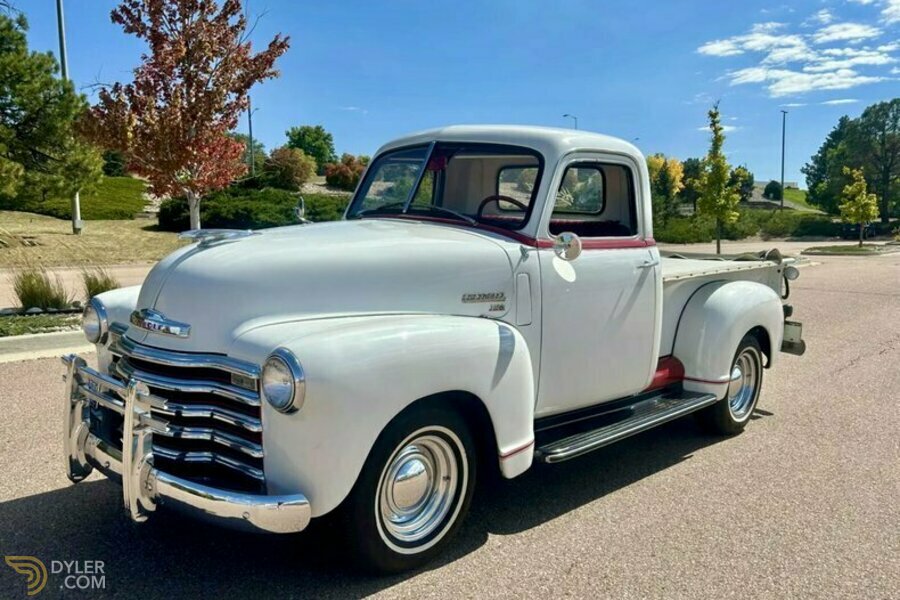 Zu verkaufen: Chevrolet 3100 Pickup, Baujahr 1950 – klassischer Charme und fahrbereit! PU DGC2379 VIN. 5HPJ32379 Begeben Sie sich mit diesem wunderschön präsentierten Chevrolet 3100 Pickup aus dem Jahr 1950 auf eine Zeitreise! Diese Vintage-Schönheit ist ein echter Hingucker und besticht durch ihr klassisches Design und durchdachte Verbesserungen, die das Fahren und Vorzeigen zu einem Vergnügen machen. Ein zeitloser Look: Mit seiner klassischen weißen Lackierung und den auffälligen roten Zierleisten strahlt dieser Chevy Vintage-Charme aus. Obwohl die Neulackierung aus dem Jahr 1985 stammt, präsentiert er sich immer noch gut und bietet eine fantastische Basis, die den Geist der damaligen Zeit einfängt. (Bitte beachten Sie, dass der Lack einige altersbedingte Gebrauchsspuren aufweist, die jedoch zum Charakter des Fahrzeugs beitragen – siehe Fotos für Details.) Das Chrom ist in ausgezeichnetem Zustand und glänzt an Kühlergrill sowie vorderen und hinteren Stoßstangen. Ein markanter Chrom-Stoßschutz an der vorderen Stoßstange verleiht dem Fahrzeug einen Hauch von Robustheit und unterstreicht den klassischen Charme des Trucks. Zwei verchromte Außenspiegel sorgen für hervorragende Sichtverhältnisse.