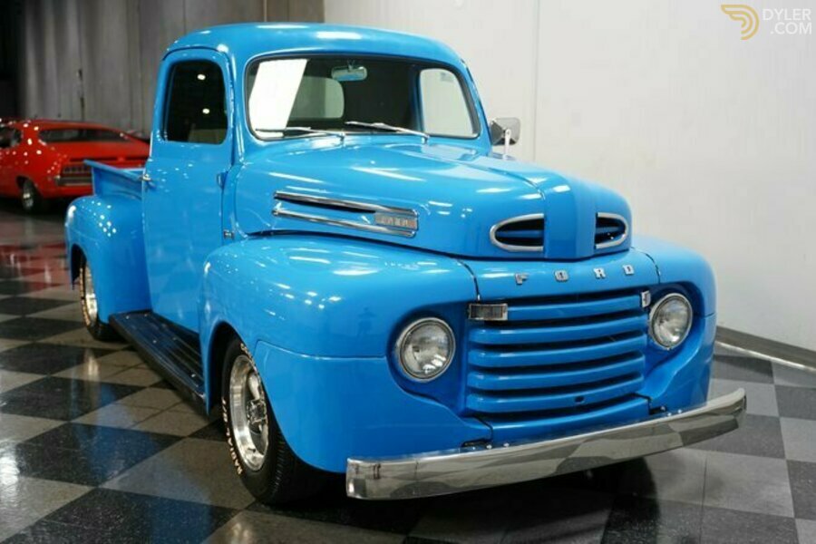 Hersteller: Ford Modell: F-1 Nachbau Preis: 38995 USD Version: Restomod Kraftstoffart: Benzin Getriebe: 4 Gang Automatik aod Farbe: Blaue Lagune Innenfarbe: schwarz und hellbraun Antrieb Räder: rwd