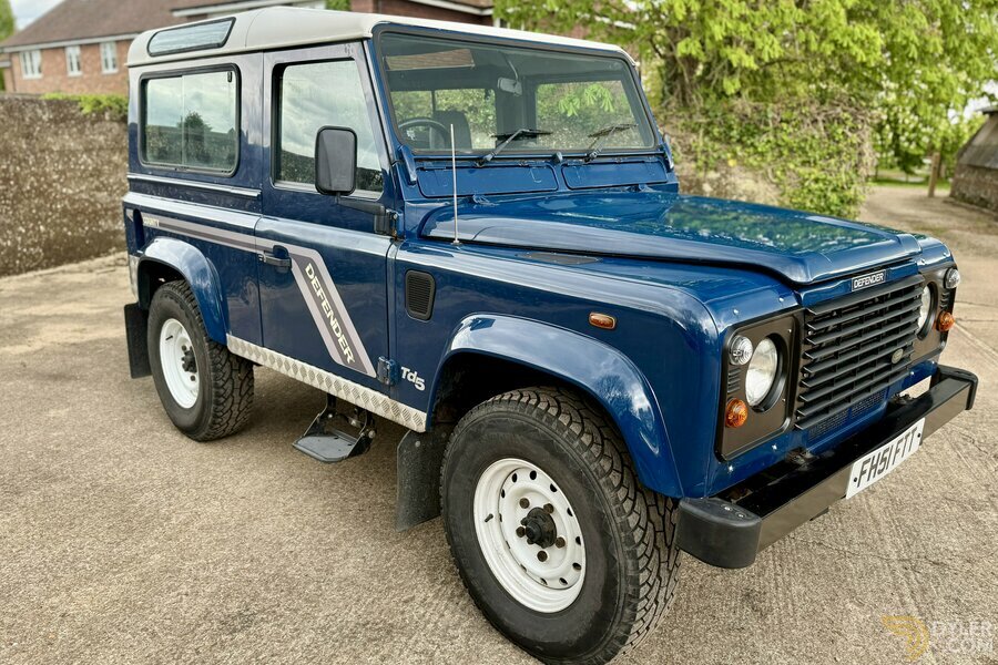 Motodrome bietet diesen sehr eleganten Land Rover Defender 90 TD5 County Station Wagon aus dem Jahr 2002 mit 6 Sitzen an, der in Blau mit weißem Dach und kontrastierender grauer Techno-Stoffausstattung lackiert ist.
