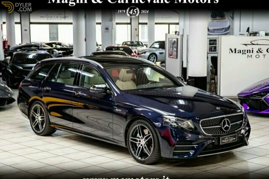 MERCEDES-BENZ E43 AMG 4MATIC AUSSENAUSSTATTUNG: METALLIC-LACK „CAVANSITE BLUE“ INNENAUSSTATTUNG: BEIGES LEDER AUSSTATTUNG: 19-Zoll-AMG-Doppelspeichenräder AMG Aerodynamik-Paket Dachreling in Chromoptik Getönte Heckscheiben