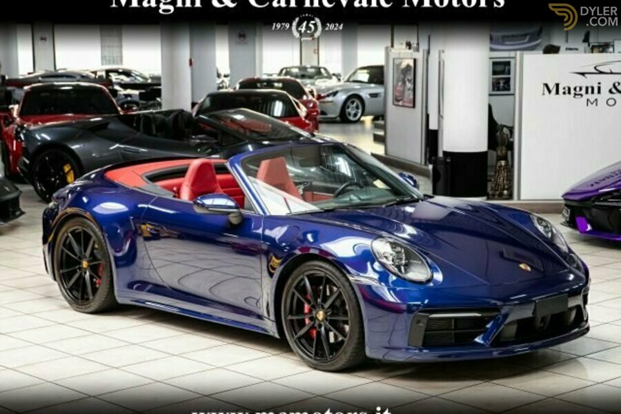 PORSCHE 992 CARRERA S CABRIO AUSSENAUSSTATTUNG: METALLIC-LACK „BLU GENZIANA” VERDECK: ROTER STOFF INNENAUSSTATTUNG: BORDEAUX-LEDER AUSSTATTUNG: Porsche Active Suspension Management (PASM) Hinterachslenkung